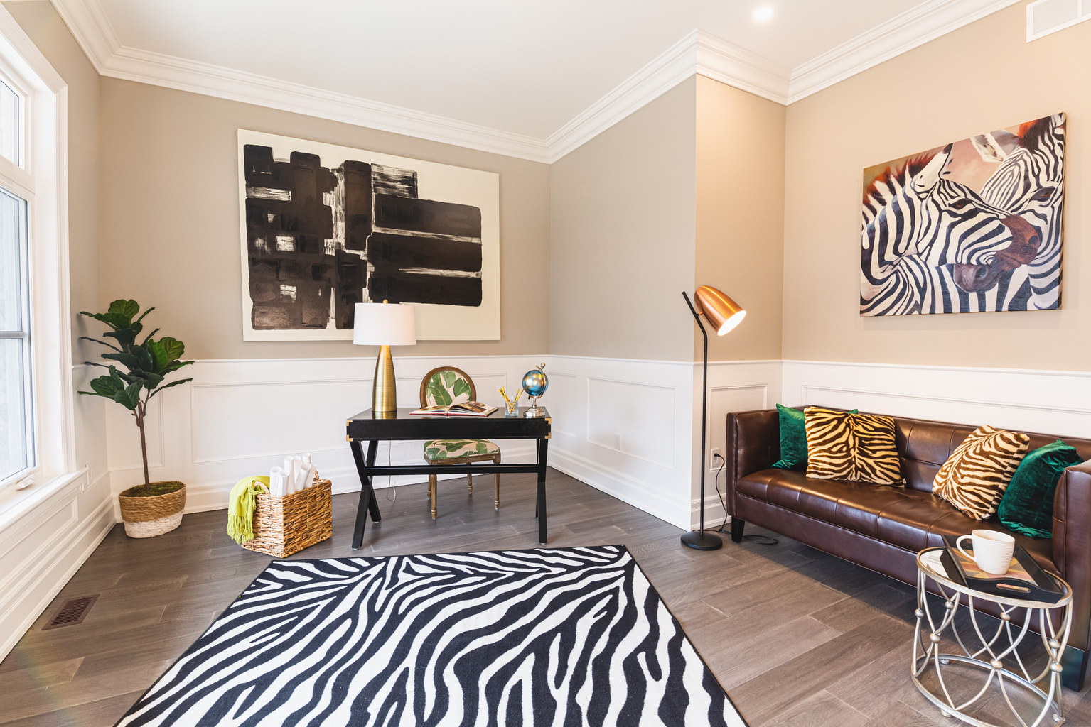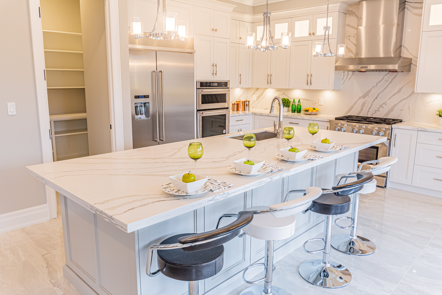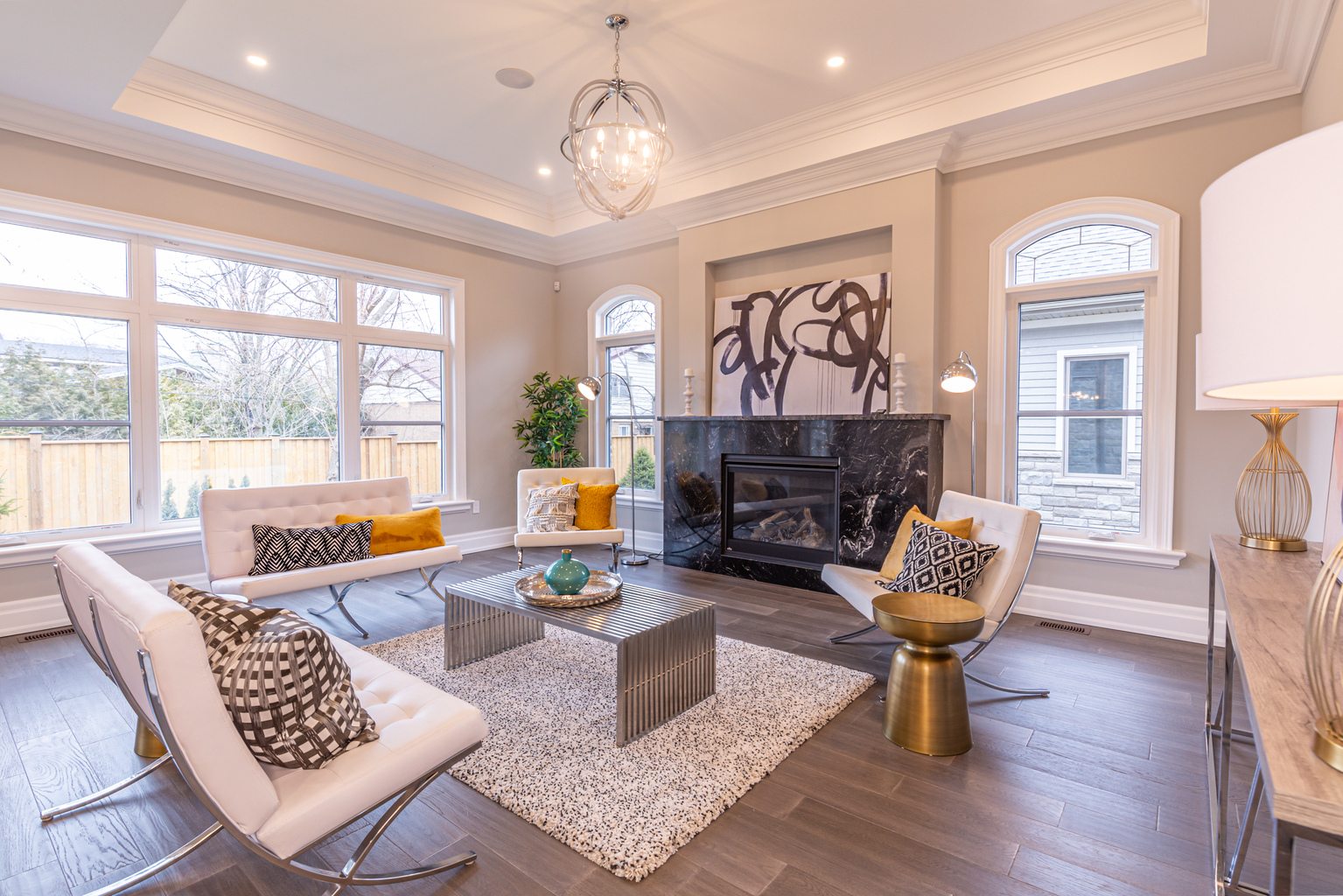 - Nine (9') foot ceilings basement - Eight (8') foot ceilings on second floor - Ten (10') foot ceilings on main floor - Red oak main staircase with wrought iron pickets - Cathedral or vaulted type ceilings (as per applicable plan/elevation) - Eight (8') foot high doors on main floor - 7-1/2" 2-step baseboards - Porcelain floors in all foyer, bathrooms, ensuites, powder room, mudrooms, and laundry room - Heated floors throughout - Smooth finish ceilings - Coffered ceilings - Pre-finished natural finish strip 6" x 3⁄4” oak or maple engineered hardwood in all bedrooms, kitchen, office, living & dining room. - Natural gas fireplace in family/living room with painted mantle and flat hearth - Custom wood wainscoting