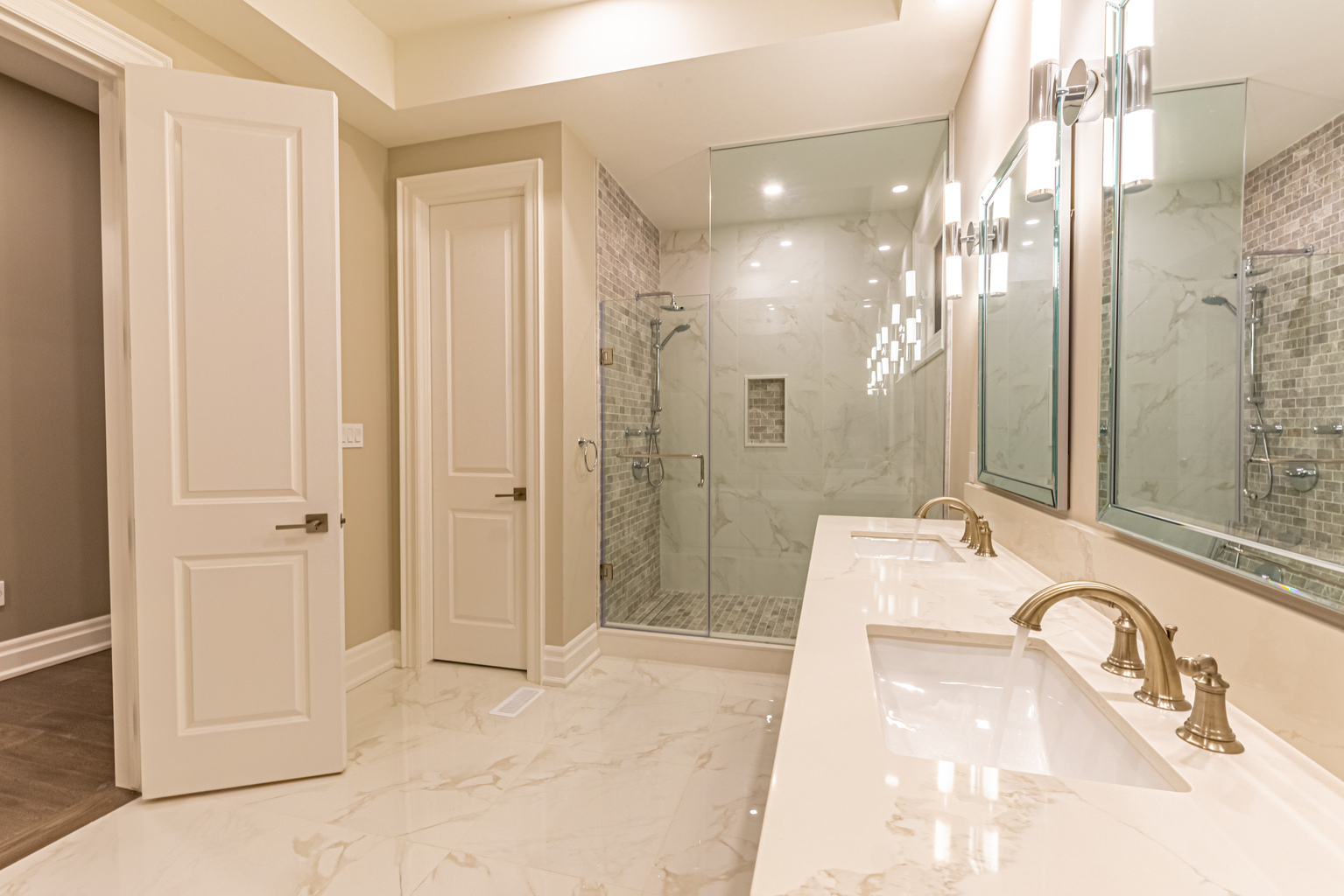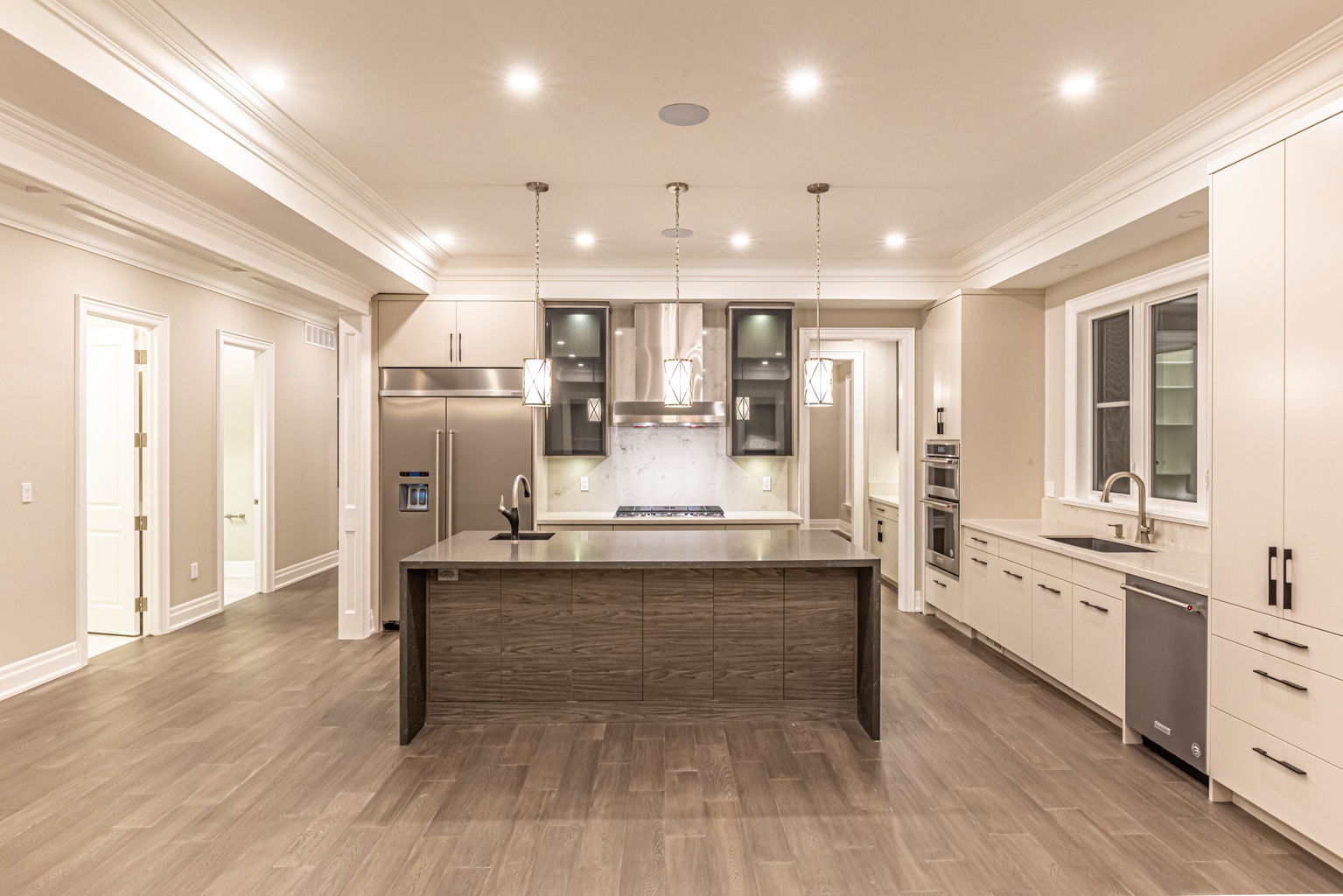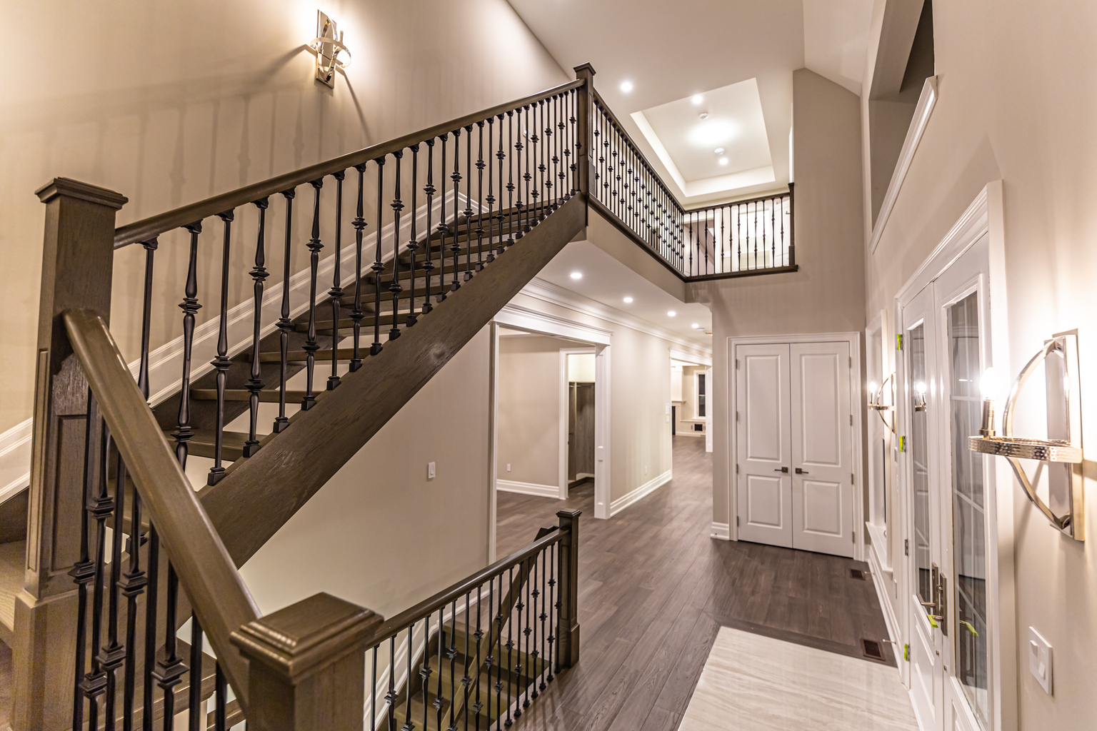 - Nine (9') foot ceilings basement - Eight (8') foot ceilings on second floor - Ten (10') foot ceilings on main floor - Red oak main staircase with wrought iron pickets - Cathedral or vaulted type ceilings (as per applicable plan/elevation) - Eight (8') foot high doors on main floor - 7-1/2" 2-step baseboards - Porcelain floors in all foyer, bathrooms, ensuites, powder room, mudrooms, and laundry room - Heated floors throughout - Smooth finish ceilings - Coffered ceilings - Pre-finished natural finish strip 6" x 3⁄4” oak or maple engineered hardwood in all bedrooms, kitchen, office, living & dining room. - Natural gas fireplace in family/living room with painted mantle and flat hearth - Custom wood wainscoting