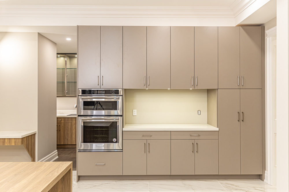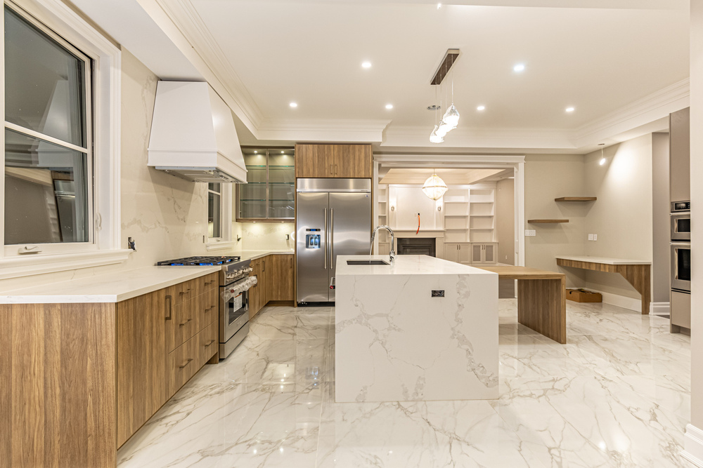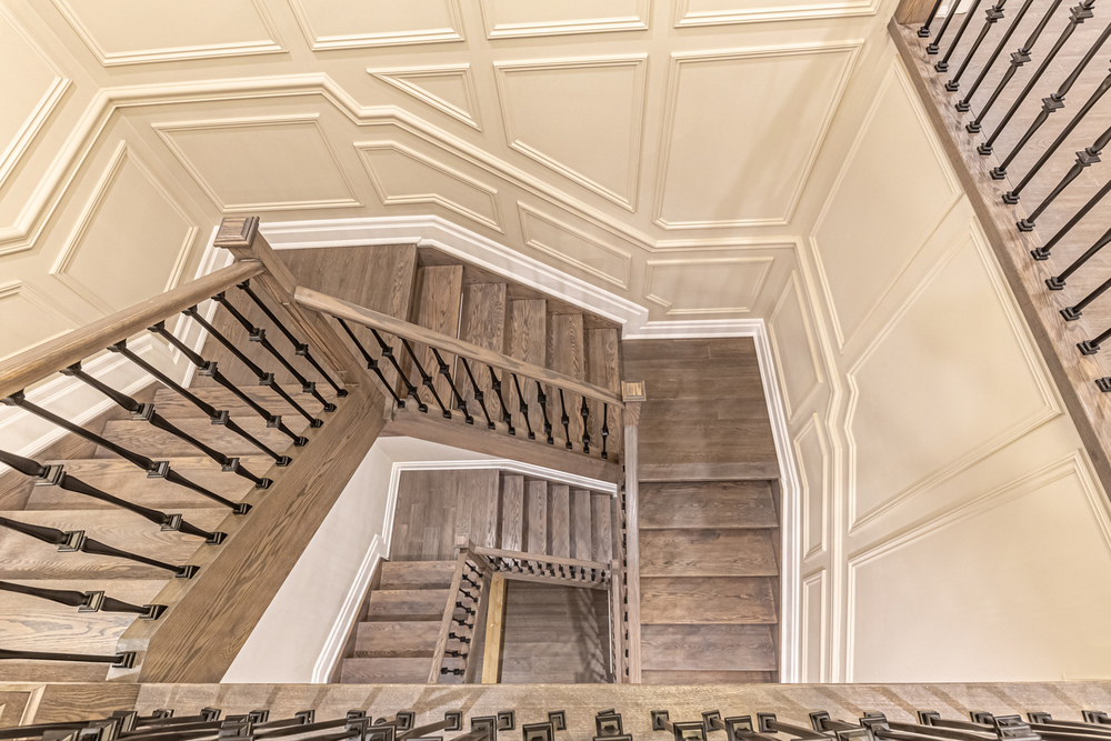 - Nine (9') foot ceilings basement - Eight (8') foot ceilings on second floor - Ten (10') foot ceilings on main floor - Red oak main staircase with wrought iron pickets - Cathedral or vaulted type ceilings (as per applicable plan/elevation) - Eight (8') foot high doors on main floor - 7-1/2" 2-step baseboards - Porcelain floors in all foyer, bathrooms, ensuites, powder room, mudrooms, and laundry room - Heated floors throughout - Smooth finish ceilings - Coffered ceilings - Pre-finished natural finish strip 6" x 3⁄4” oak or maple engineered hardwood in all bedrooms, kitchen, office, living & dining room. - Natural gas fireplace in family/living room with painted mantle and flat hearth - Custom wood wainscoting
